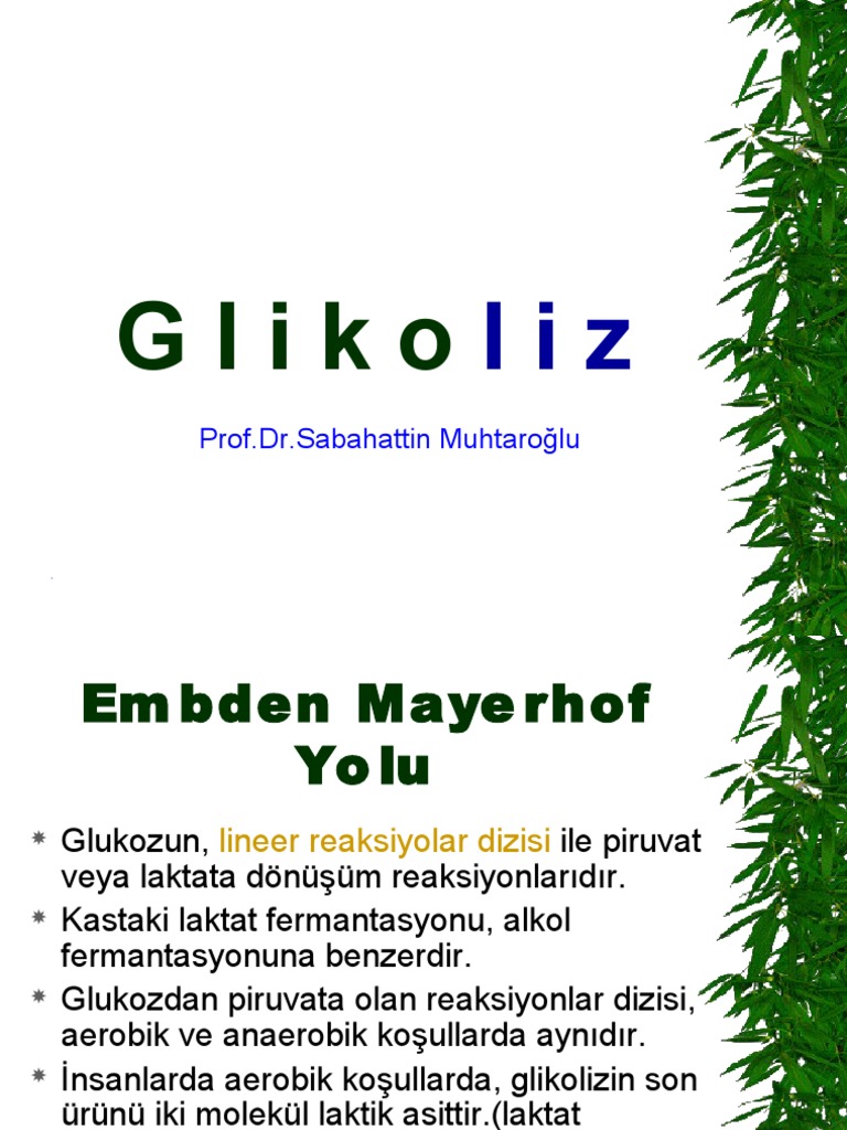 Glikoliz olan metabolik yol dönüştüren glukoz cı 6 h 12 o 6 , içine pirüvik asit , ch 3 cocooh. • glikoliz, yunanca glykys (tatlı, şeker) ve lysis (bölünme, parçalanma) ve sözcüklerinden kaynağını alır. Atp üretir ve hücresel solunumun ilk aşamasıdır. Glikozun tamamen parçalanması, anaerobik ve aerobik tepkime serileri arasında gelişen ve bu işlemin anaerobik kısmı, yani glikoliz olarak da bilinen glikozun piruvik asite parçalanması, yoldaki. Clylys — shirin va lysis — parchalanish) — uglevodlar (asosan glyukoza)tt sut kislotasigacha anaerob parchalanish jarayoni;